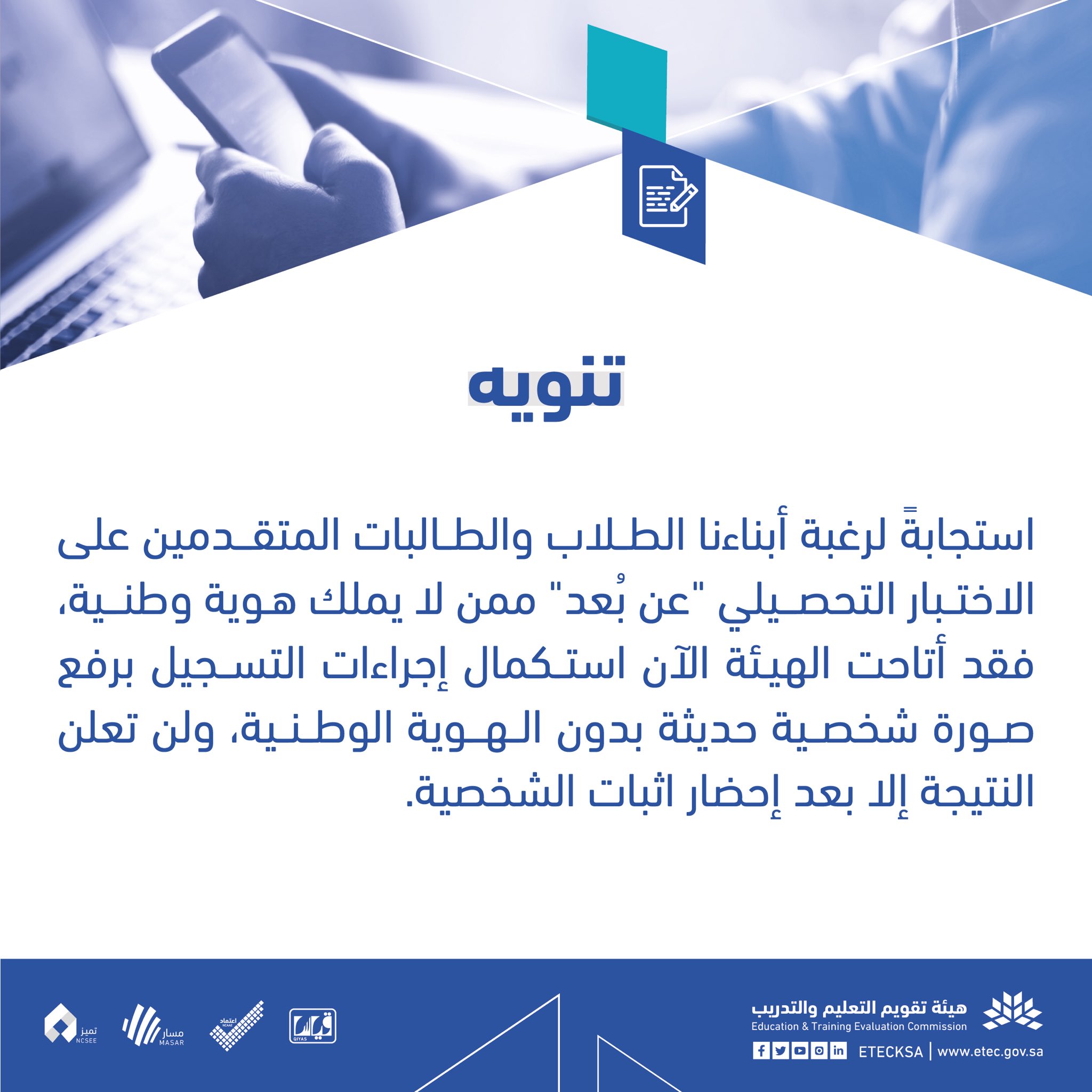 هيئة تقويم التعليم والتدريب On Twitter تنويه استجابة لرغبة بعض أبنائنا الطلاب والطالبات المتقدمين على الاختبار التحصيلي عن ب عد ممن لا يملك هوية وطنية فقد أتاحت الهيئة استكمال إجراءات التسجيل برفع صورة