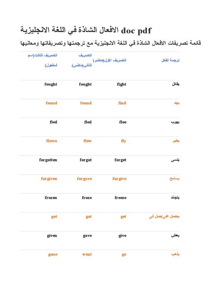 الافعال الشاذة في اللغة الانجليزية Doc Pdf
