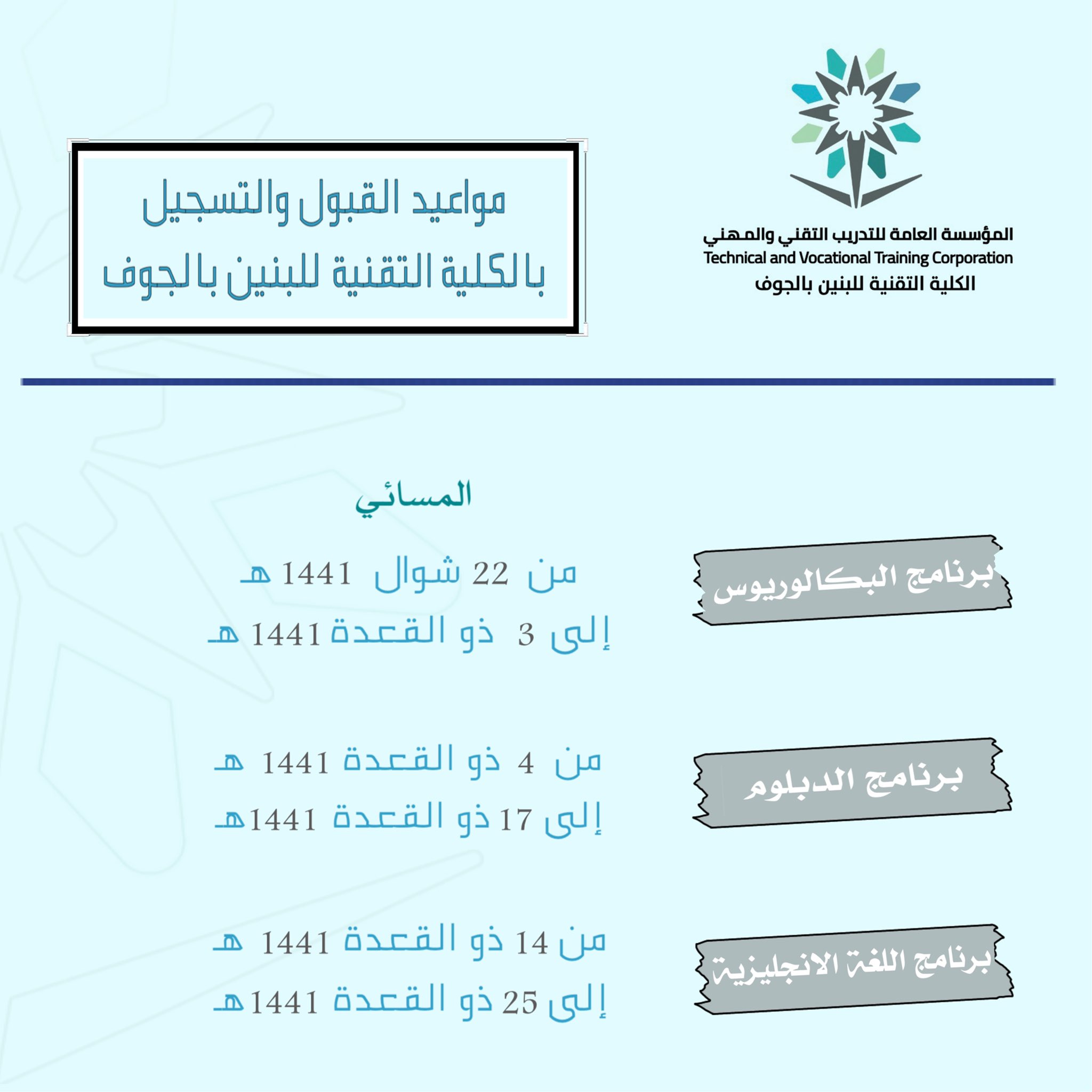 كلية التقنية للبنين بالجوف نعود بحذر V Twitter مواعيد القبول والتسجيل بالكلية التقنية بالجوف للفصل الأول من العام التدريبي 1442 هـ التدريب التقني انا جالس في بيتي كلنا مسؤول Https T Co Yhxe4ajyjk