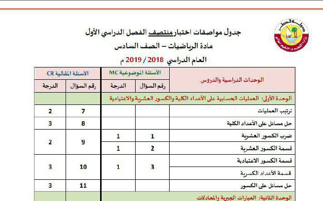 جدول مواصفات اختبار نصف الفصل مادة الرياضيات الصف السادس الفصل الأول المنهاج القطري 2018 2019 منتديات صقر الجنوب
