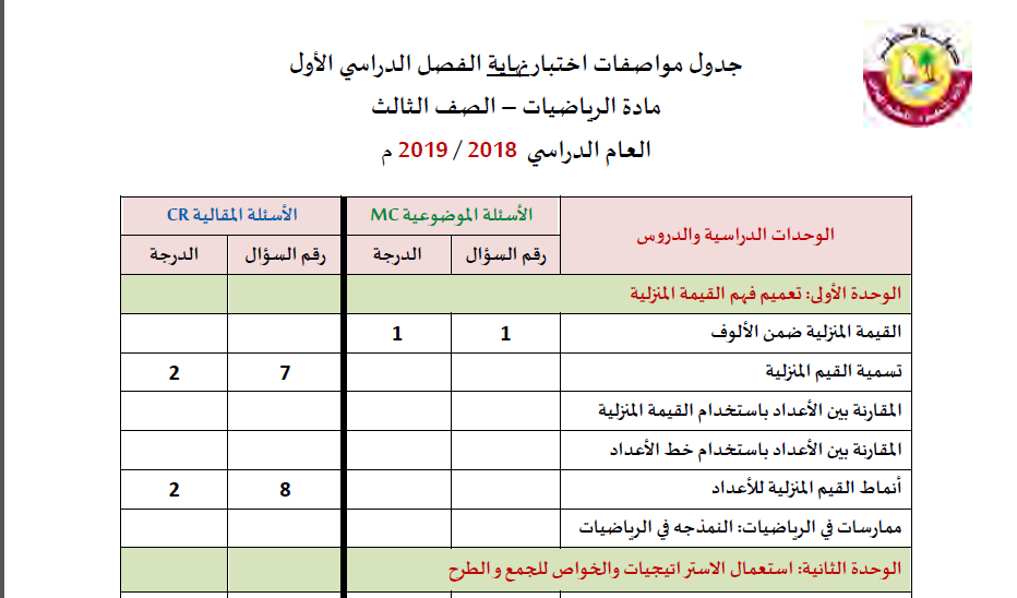 جدول مواصفات اختبار نهائي لمادة الرياضيات للصف الثالث الفصل الاول المنهاج القطري 2019 منتديات صقر الجنوب