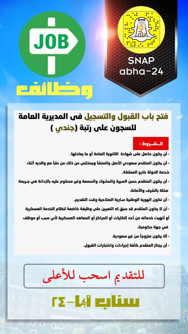 سناب أبها ٢٤ On Twitter جديد الوظائف أعلنت المديرية العامة للسجون ممثلة بالإدارة العامة للقبول المركزي بوكالة وزارة الداخلية للشؤون العسكرية عن فتح باب القبول والتسجيل بالمديرية العامة رجال نساء سناب ابها ٢٤ عسير ابها